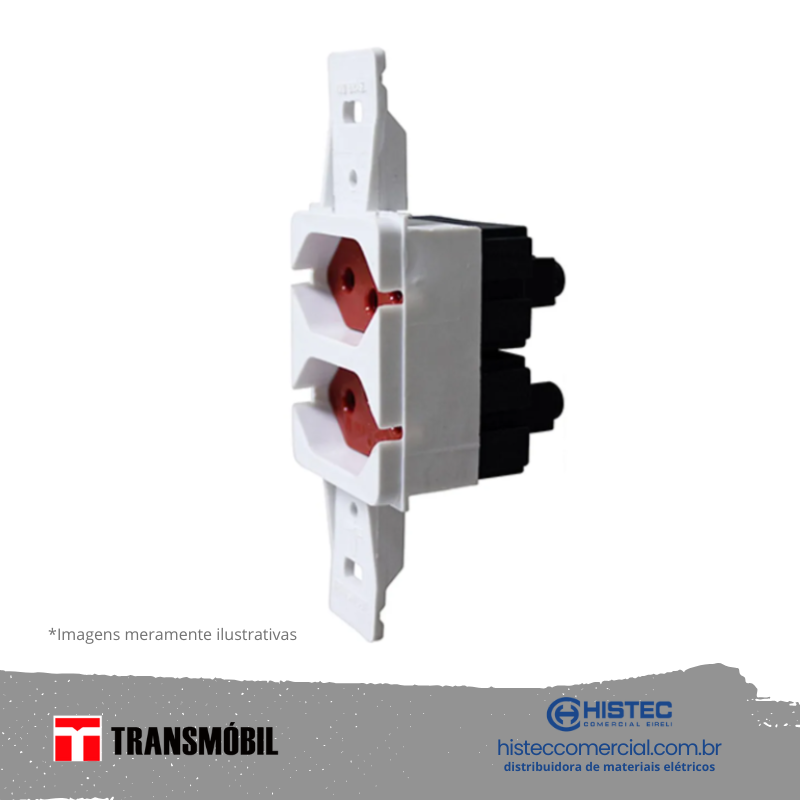 O modelo 14050 da Transmobil é composto por duas tomadas do tipo 2P+T (3 pinos), compatíveis com plugues no padrão NBR 14136, indicado para uso em ambientes residenciais, comerciais ou industriais de baixa demanda elétrica.